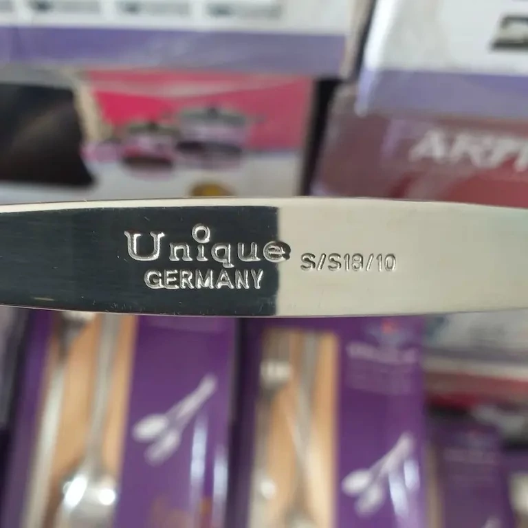 در پشت هر یک از قاشقها و چنگالها عبارت Unique Germany حک شده است که نشاندهنده برند محصول است. این حکاکی علاوه بر نشان دادن اصالت محصول، جلوهای حرفهایتر به آن میدهد.